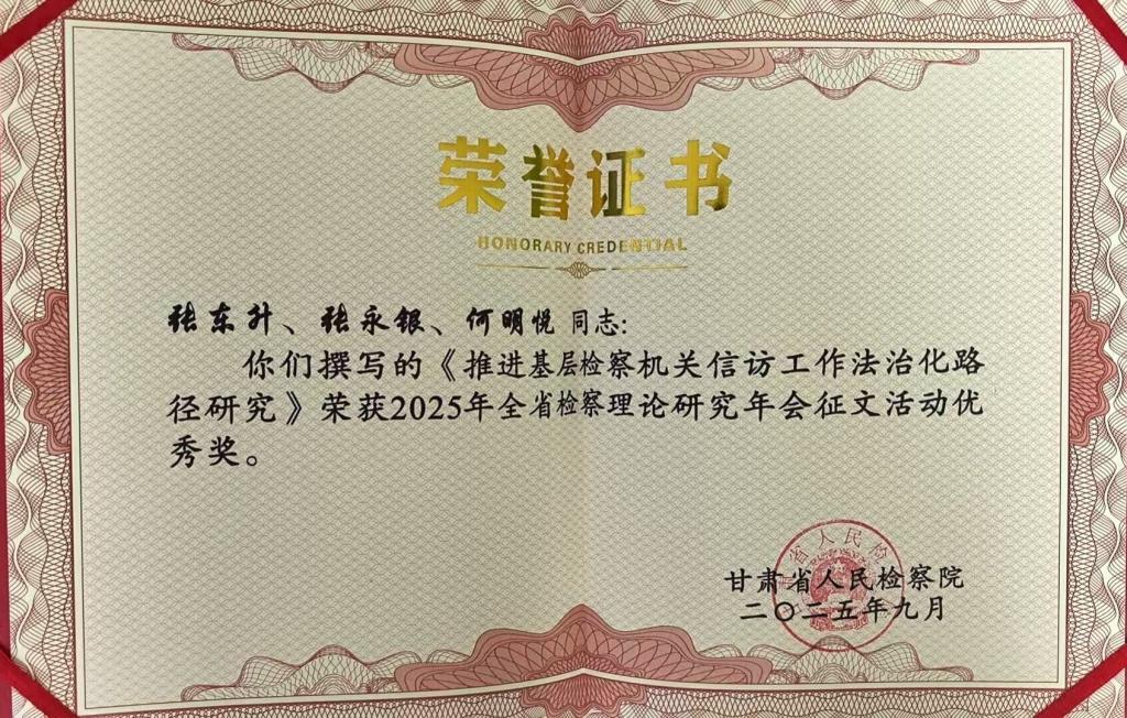 近日,2025年全省检察理论研究年会暨“法润丝路”检察理论研讨会在武威召开。我院理论文章《推进基层检察机关信访工作法治化路径研究》获评全省检察理论年会优秀奖。
